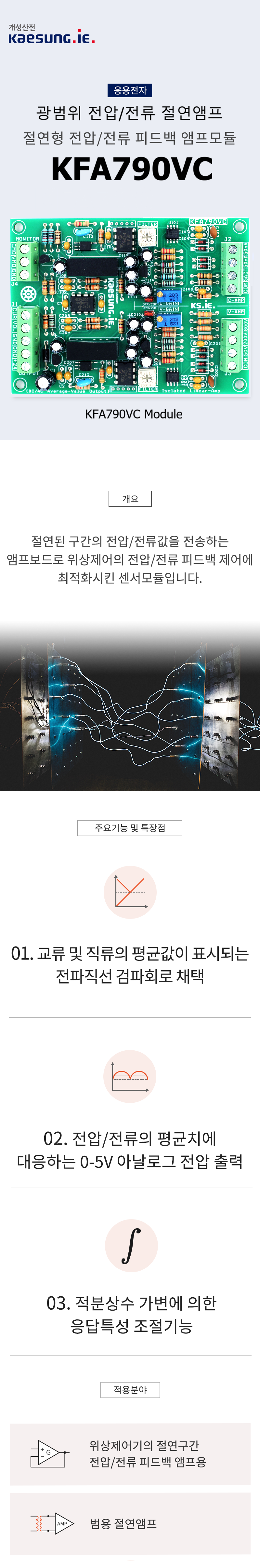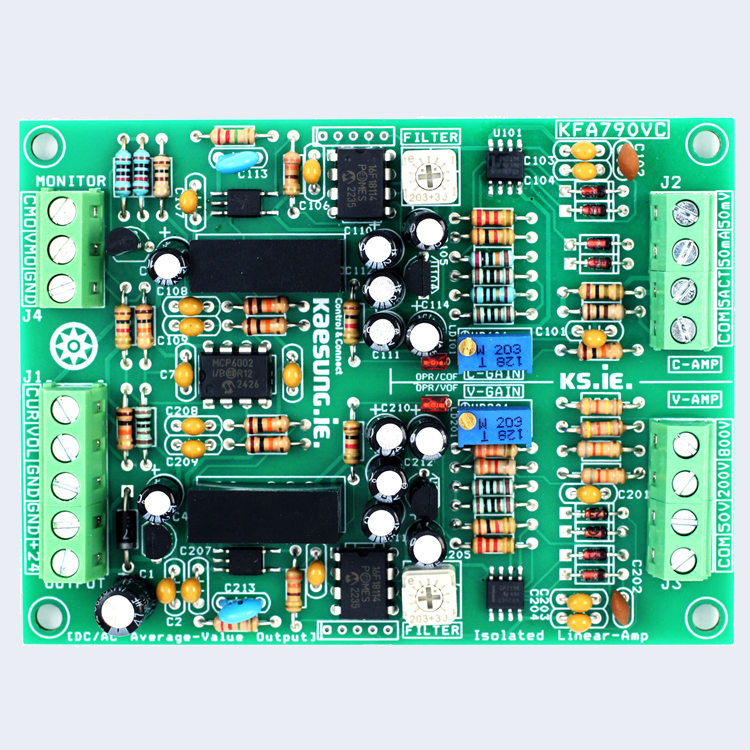 KFA790VC는 절연된 구간의 전압/전류(직류 및 교류)값을 전송하는 센싱앰프 보드이며, 위상제어의 전압/전류 피드백제어에 최적화시킨 것으로 개발되었지만, 범용 절연구간 전류 및 전압 센싱앰프로도 활용이 가능합니다.