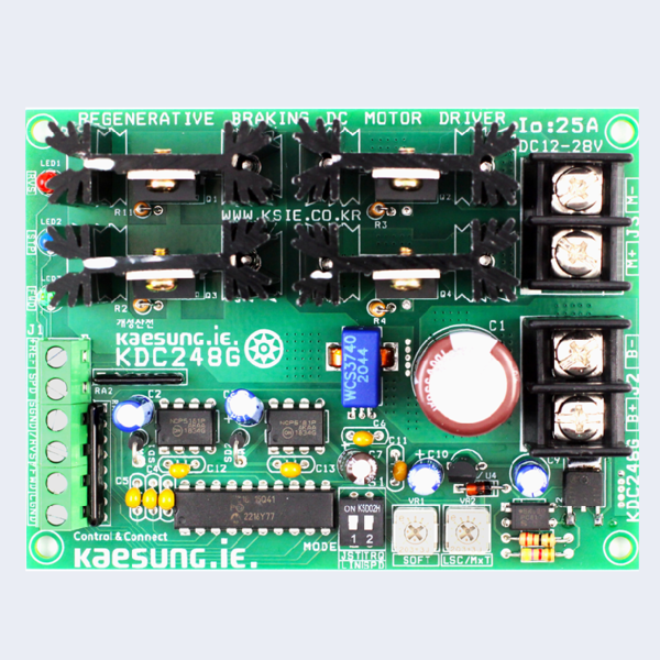 KDC248G는 KDC248H의 업그래이드 모델로, DC12-28V의 구동전원을 지원하는 직류모터 스피드 콘트롤러 모듈로써, 연속운전 전류25A(38A_OCR, 60A_50mS 보호,드라이버 용량 95A)의 정격을 가지며 감속 혹은 역구동 시 회생에너지를 전원측으로 돌릴 수 있는 회생제동 감속형 직류 모터속도제어 모듈입니다.