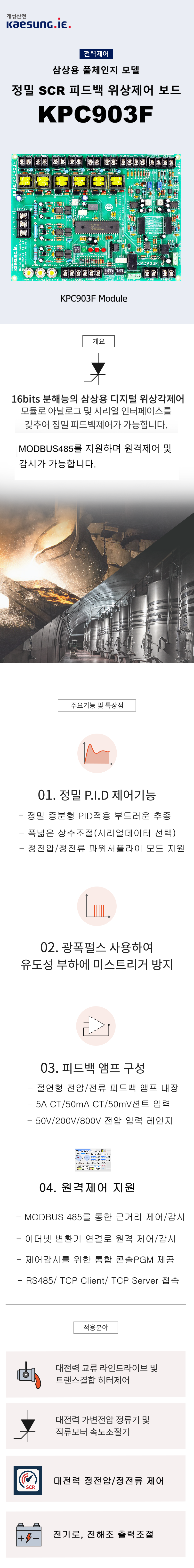 KPC903F는 16bit분해능의 Full 디지털화된 삼상 아날로그 및 시리얼 인터페이스 정밀 위상제어 모듈로써, 기존 모델보다 신뢰성은 높이고 위상제어기와 직선성 높은 절연형 전압/전류 피드백앰프를 내장한 범용 삼상 피드백 위상제어기의 마지막 버전입니다.